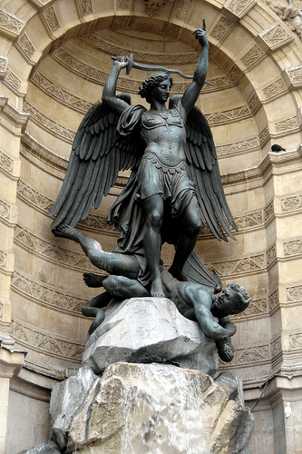 Who is St. Michael, and who are all the angels? In art, and poetry, and Scripture, we see the Angels surrounding the throne of God, moving back and forth between heaven and earth, ministers of God to his creation. We see the high drama of heavenly battle: Michael with his sword and shield casting the devil out of heaven: Satan, formerly chief of the angels, corrupted by pride, defeated by Michael, leader of the heavenly host. Milton attributes to Satan the battle cry, “Better to reign in hell, than serve in heaven.” And so he falls, to tempt the earth.